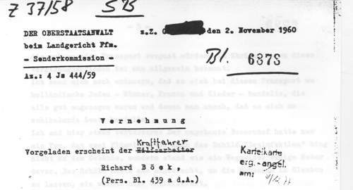 Bleiben Meyers und Süßmuths Aussagen, wie oben zitiert, ungestraft, stürzt die Offenkundigkeit, und damit die Verfolgungslogik, ein. Denn dann könnten sich in Zukunft forschende Menschen auf diese Veröffentlichung beziehen, wenn sie die Offizialversion nicht mehr glauben können, sofern es nur ansatzweise rechtsstaatliche Verhältnisse geben sollte. Wenn Meyer behauptet, "der Genozid fand wahrscheinlich überwiegend in den beiden umgebauten Bauernhäusern" statt, dann bezieht er sich auf den Augenzeugen Richard Böck. Im folgenden DIE zentrale Passage von Richard Böcks Aussage als Zeuge im Frankfurter Auschwitz-Prozess bezüglich der Vergasungen in genau diesen von Meyer erwähnten Vergasungs-Bauernhäusern: |