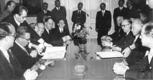 Am 20. März 1952 begannen die Wiedergutmachungsverhandlungen zwischen Israel und Deutschland. Das Abkommen wurde am 10. September (Bild) unterschrieben. |