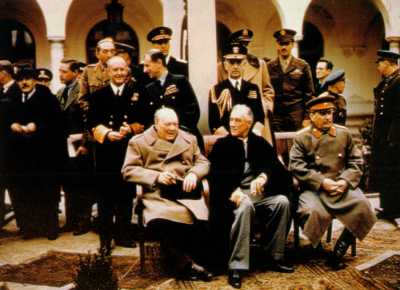 Auf der Konferenz von Jalta im Februar 1945 ver-einbarten die siegreichen Alliierten, am deutschen Volk die grauenhaftesten Verbrechen gegen die Menschlichkeit zu verüben. Für diese von den Demokraten, den Führern der "zivilisierten" Welt, beschlossenen Verbrechen gegen die Demokratie und die Menschlichkeit, hätten sie gemäß ihren eigenen juristischen Siegermaßstäben des Sieger-tribunals von Nürnberg selbst am Galgen enden müssen. Die Täter aber ließen die unterlegenen Deutschen hängen und sorgten dafür, daß während des Schauprozesses gegen die Verlierer des 2. Weltkriegs deutsche Kinder und Frauen in Todes-lagern ermordet wurden. Die BRD-Politiker ver-höhnen die Opfer und feiern die Mordtaten als "Befreiung". Vorn v.l.n.r.: Briten-Premier Churchill, US-Präsident Roosevelt und Kreml-Diktator Stalin. |