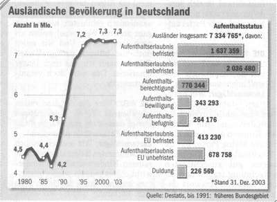 In der WELT eine Graphik (rechts) abgebildet, wonach sich der Ausländeranteil in der BRD von 1990 auf 1991 sprunghaft um fast zwei Millionen erhöhte (von angeblich 5,3 Millionen auf 7,2 Millionen). Gemäß dieser statistischen Tafel-Graphik sind seit 1991 bis Ende 2003, also 13 Jahre lang, quasi keine neuen Ausländer mehr nach Deutschland zugezogen. 1991 sollen 7,3 Millionen Ausländer gemäß Graphik in der BRD gelebt haben und am 31.12.2003 sollen es exakt 7.334.765 gewesen sein (wie diese wohl gezählt wurden). Da es eine Tatsache ist, dass jährlich etwa eine Million Ausländer neu nach Deutschland durch die "Einfallstore" drängten, wurden also bei der offiziellen Statistik von 2003 mindestens 13 Millionen Fremde unterschlagen. Kein geringerer als der ehemalige Bayerische Ministerpräsident Edmund Stoiber (CSU) war es, der versuchte, die Gefahr herunterzuspielen, indem er die jährliche Anzahl von fremden Landnehmern auf immerhin noch auf 700.000 Sozialhilfeempfänger aus aller Herrenländer ansetzte. Stoiber: "Wir haben heute schon eine Zuwanderung von bis 700.000 Menschen pro Jahr." [2] DIE WELT verbreitet seit Jahren auftragsgemäß die statistische Lügenkonstruktionen über den Ausländeranteil in der BRD. Beispiel 2000: "Hat sich die Zahl der Ausländer seit 1972 auf 7,3 Millionen verdoppelt." [3] Alleine seit dem Jahre 2000 hätte sich der Ausländeranteil im Jahr 2004 aber um vier Millionen, auf 11,3 Millionen, erhöhen müssen. Selbst DER SPIEGEL predigte noch 2004 die magische Zahl von 7,3 Millionen Ausländer in der BRD: "7,3 Millionen friedlicher Ausländer in Deutschland." (s.o.) Die Zahlenakrobatik zur Verdummung der Deutschen treibt im Hamburger Nachrichtenmagazin ohnehin schon immer seltsame Blüten. In der Nummer 47/2004 auf Seite 62 nennt DER SPIEGEL folgende Zahlen: "Türken in Deutschland insgesamt 2003: 1,9 Millionen". Ein Seite weiter liest man dann folgendes: "3,2 Millionen Muslime in Deutschland, von denen die meisten - 2,5 Millionen - türkischer Herkunft sind." Eine eher wahrheitsgemäße Darstellung der verheerenden BRD-Situation veröffentlichte das Hamburger Wochenmagazin im Jahr 2000, wo man folgendes lesen konnte: "Rund 29 Millionen Menschen strömten zwischen 1950 und 1997 als Arbeitsmigranten, nachziehende Familienangehörige, Aussiedler oder Asylbewerber in die Bundesrepublik." [4] Wie schon immer planmäßig gelogen wurde, um die Deutschen zu verdummen und zu betäuben, damit sie ihren Untergang verschlafen, sei an folgendem Beispiel aus dem Jahr 1995 verdeutlicht: