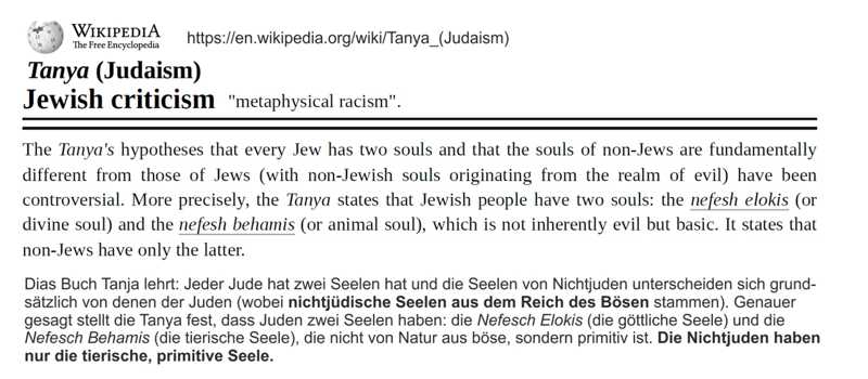 Das Buch "Tanja" (Die Lehre) "ist eine philosophische Abhandlung über einige der wichtigsten und grundlegendsten Prinzipien des Chassidismus", also der chassidischen jüdischen Religion. Autor: Rabbi Schneur Salman. Die Lehre besagt, dass die Nichtjuden nur eine "tierische Seele" haben.