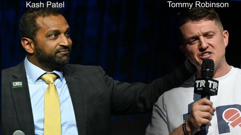 FBI-Chef Kash Patel und Tommy Robinson. Patel kehrt der Judenbibel für Walhall den Rücken und Robinson bringt in London eine Million Menschen gegen das System auf die Beine